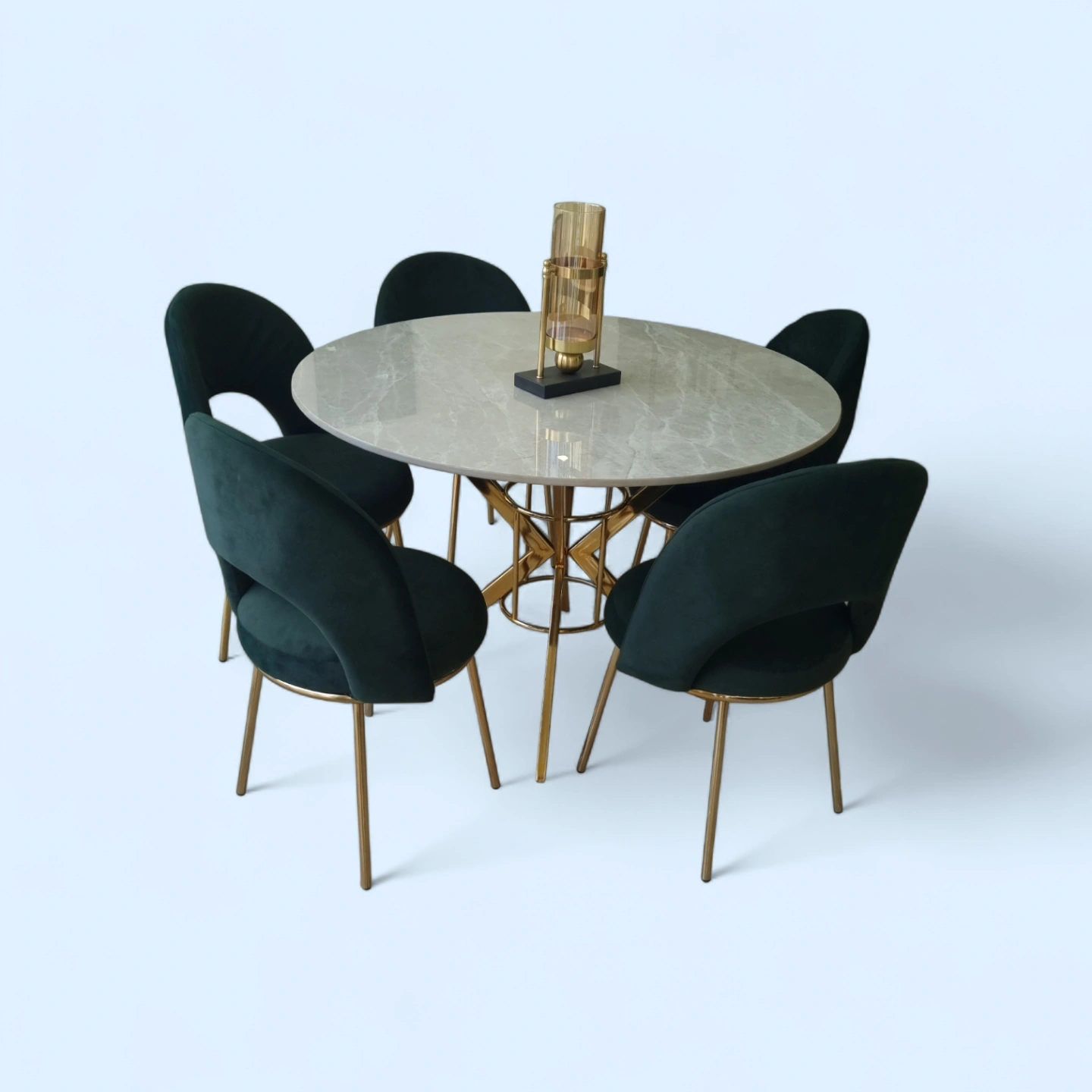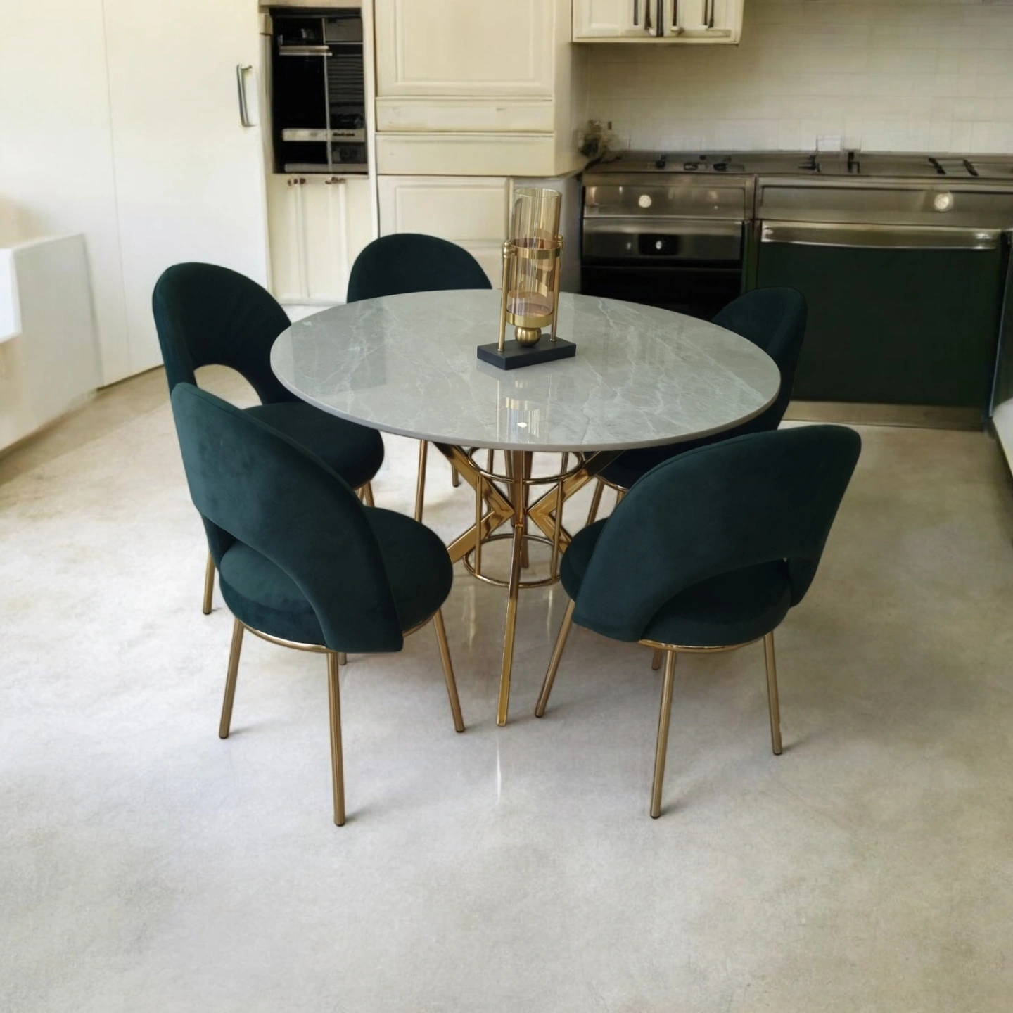 The Aurelia Round Marble Dining Table is crafted for those who appreciate modern elegance and balanced design. Its round marble tabletop offers a spacious and refined surface, while the sculptural gold-finish stainless steel base adds a touch of luxury without overpowering the space. Ideal for both compact and open dining areas, this table blends durability with timeless style, making it suitable for daily use as well as special occasions.