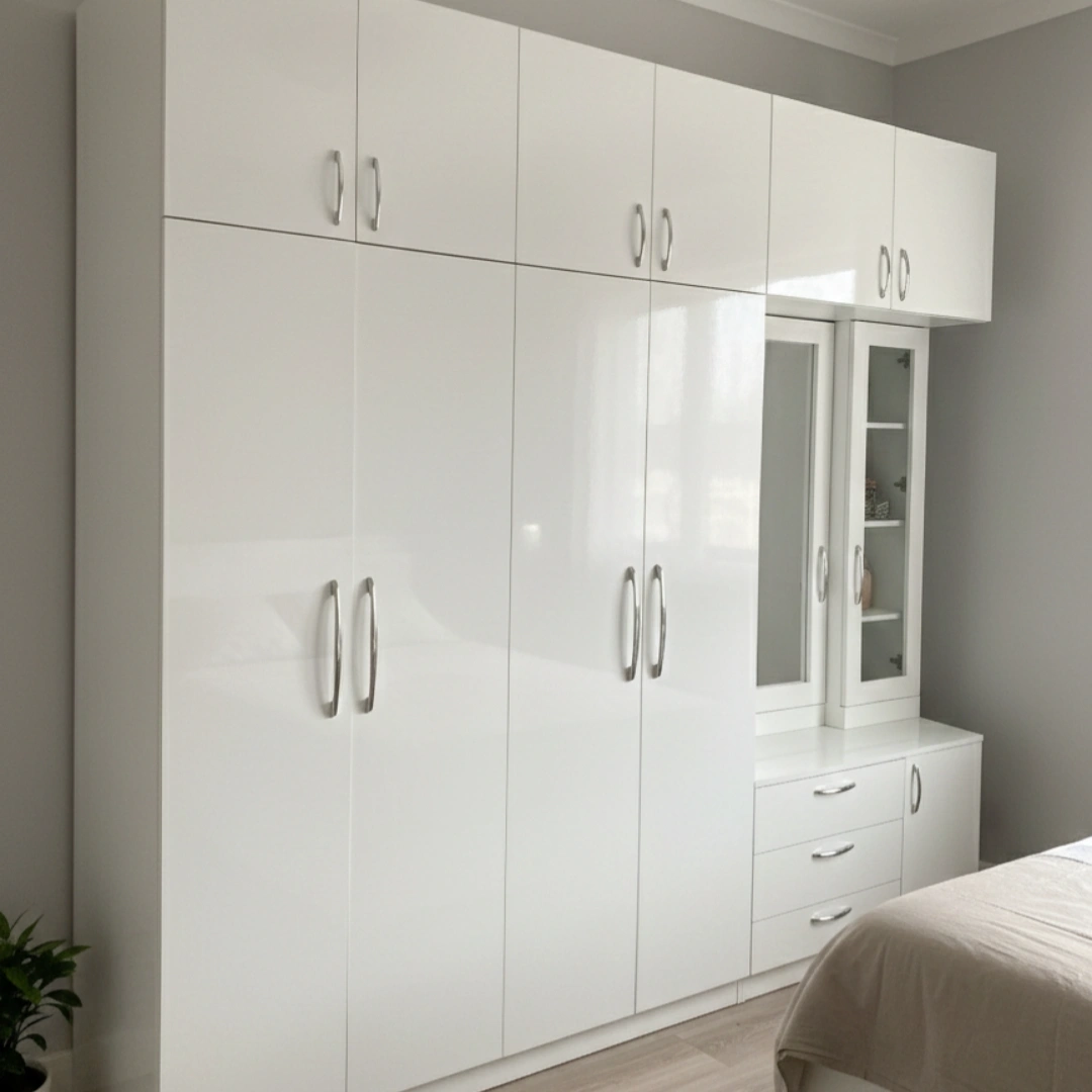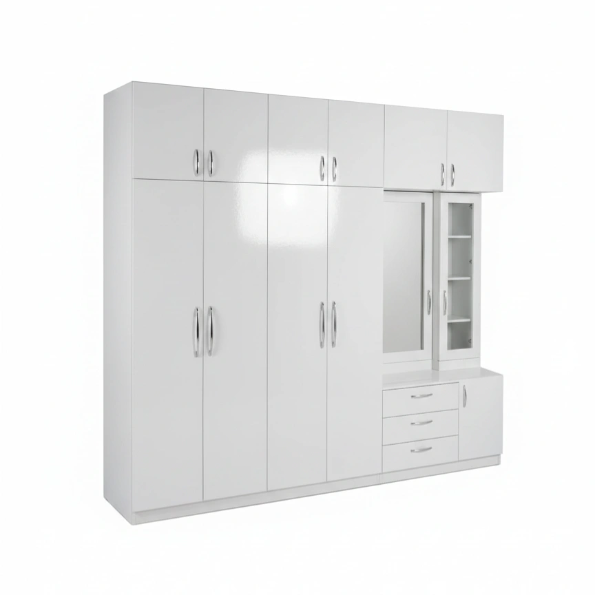 A spacious, high-gloss white modular wardrobe featuring multiple storage cabinets, a built-in dressing mirror, drawers, and display shelves—perfect for modern bedrooms.