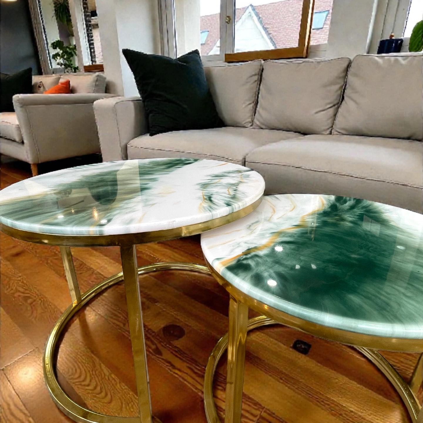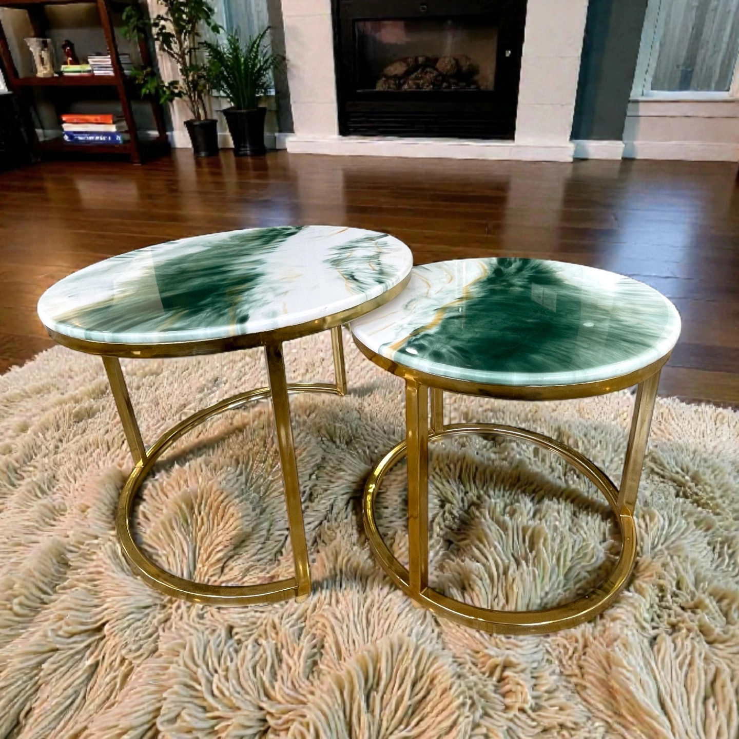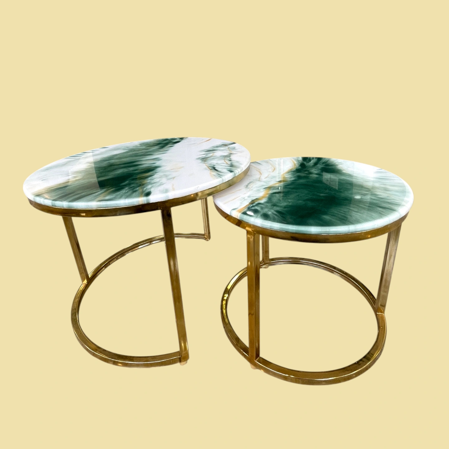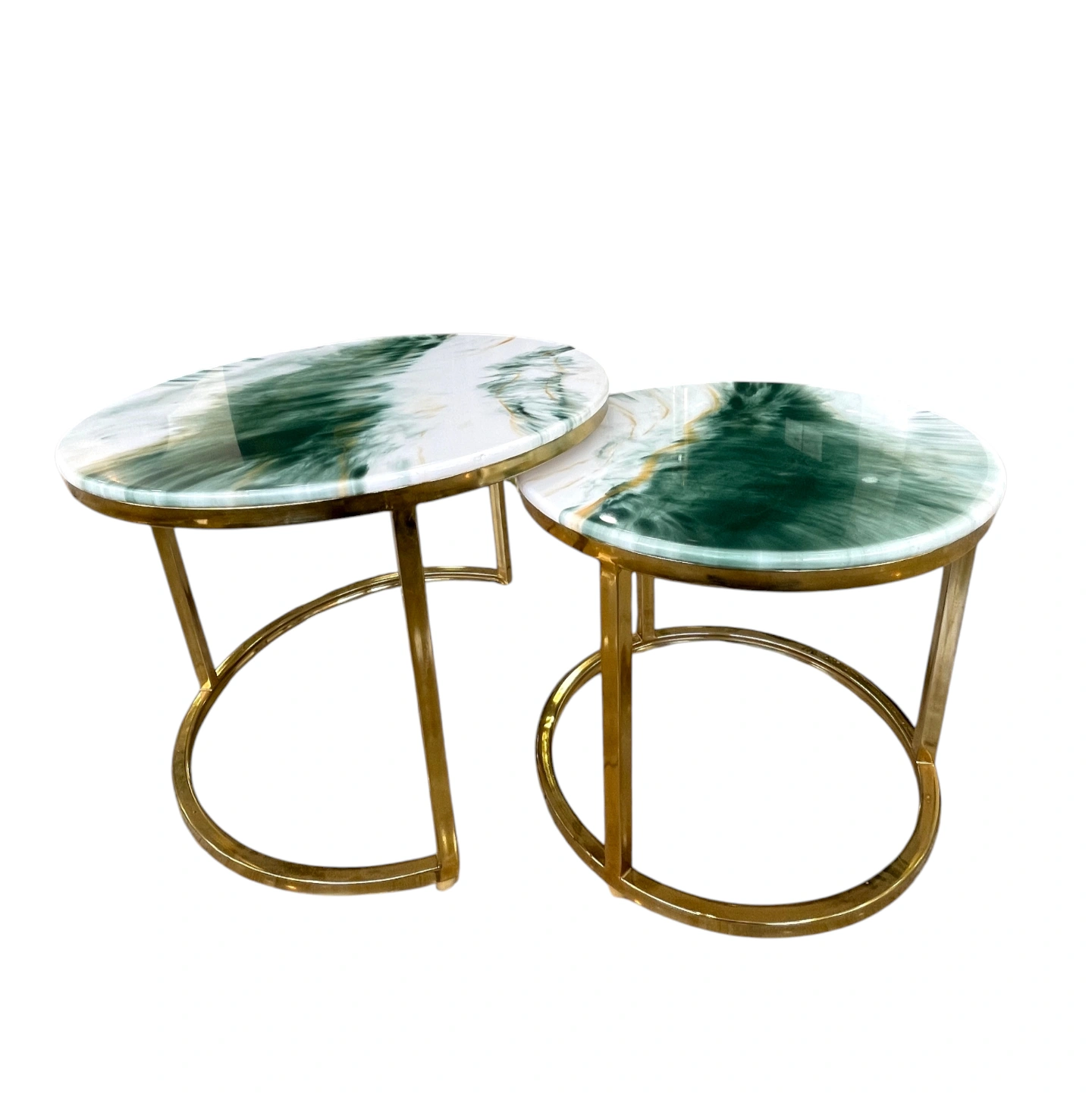 A premium two-piece coffee table set featuring emerald-inspired glossy tops and modern gold steel frames—designed to add elegance and style to any living room.