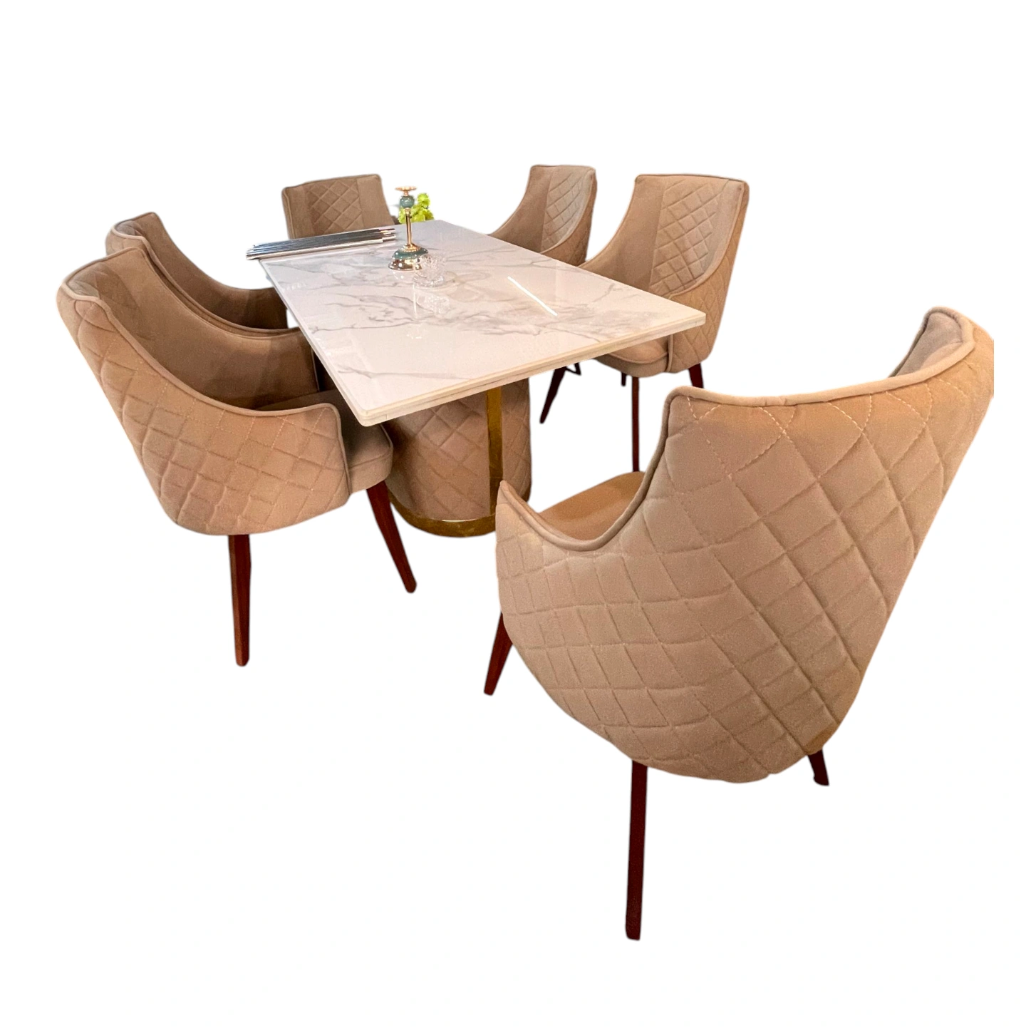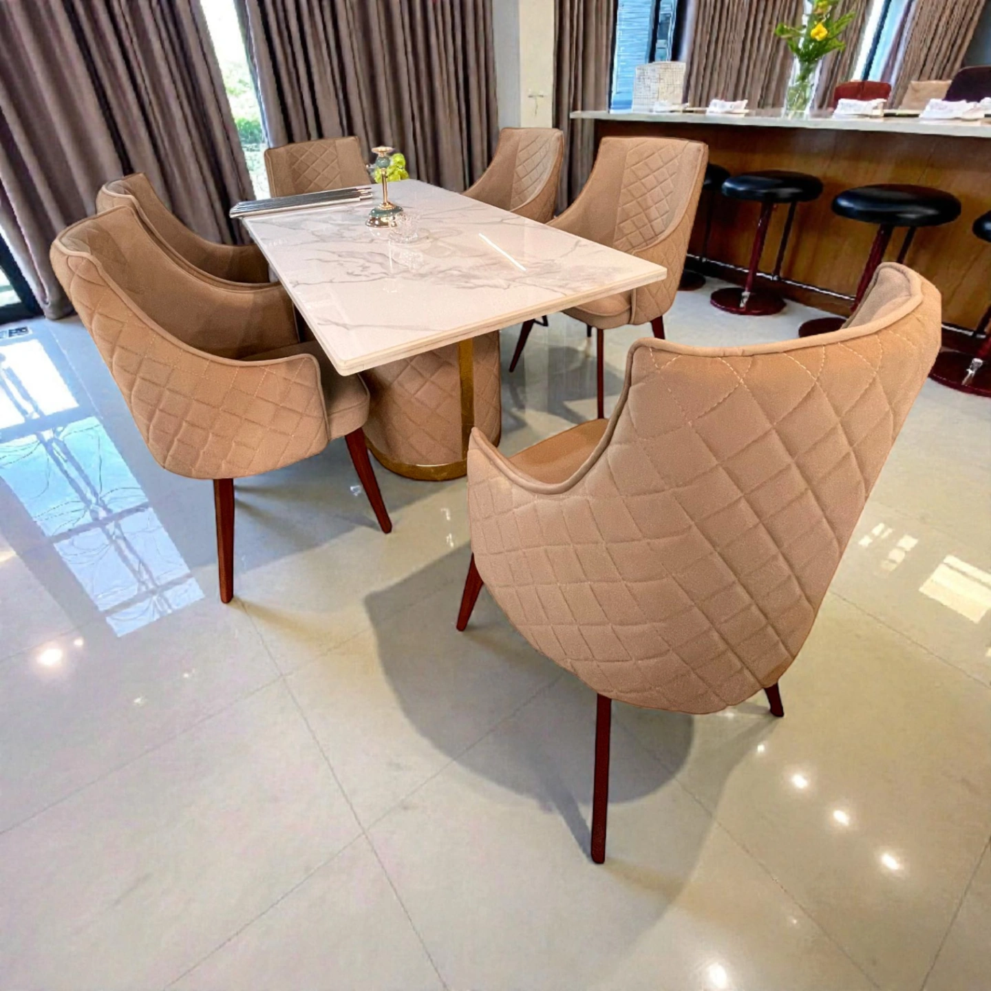 modern 6-seater dining set featuring a sleek marble-finish table paired with quilted, cushioned chairs for a luxurious and comfortable dining experience.
